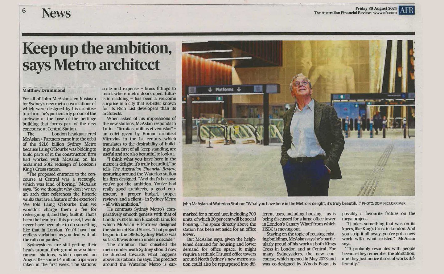 The London-headquartered McAslan + Partners came into the orbit of the $2L6 billion Sydney Metro because Laing O'Rourke was bidding to build parts of it; the construction firm had worked with McAslan on his acclaimed 2012 redesign of London's King's Cross station.