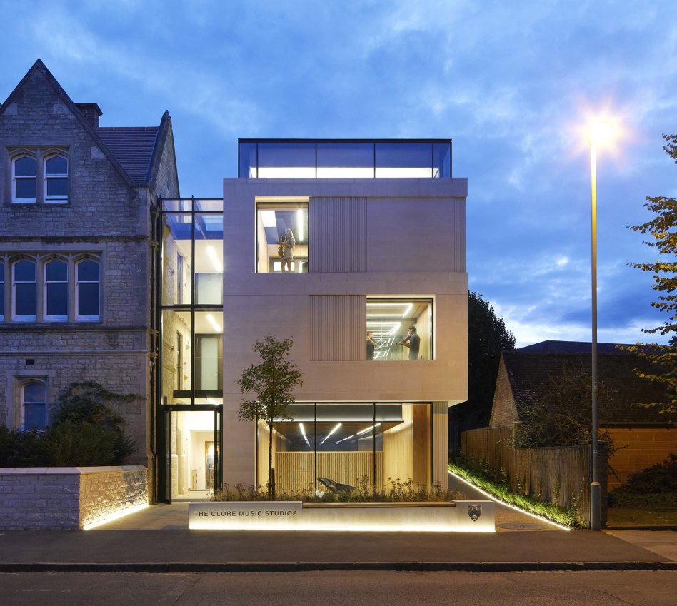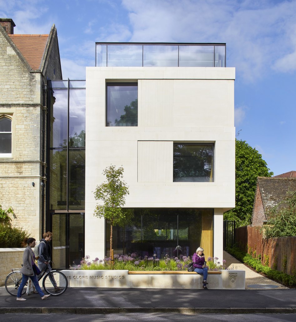 Set within Oxford’s Central Conservation Area, The Clore Music Studios is a contemporary stone-clad building sympathetic to its historic context. Over three levels the building provides a range of high quality performance spaces for the practice and study of music, opera and drama. A large rehearsal room occupies the ground floor, with upper floors containing two medium-sized chamber music studios and a series of solo or duo practice rooms.
