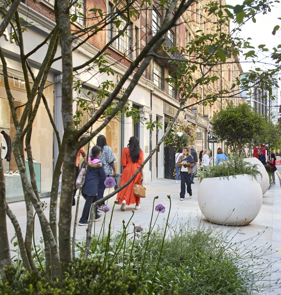 The scheme features a rich palette of York Stone and silver-grey granite, with new trees and extensive planting which had been overseen by Chelsea Flower Show award winner Andy Sturgeon. Significantly wider pavements, traffic-calming measures, more crossing points, improved lighting and new street furniture now ensure a more pleasurable experience for pedestrians.