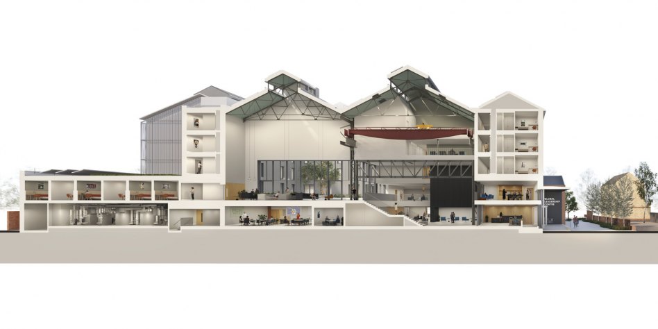 John McAslan + Partners’ international competition-winning design for the Global Leadership Centre at Saïd Business School, University of Oxford repurposes the former Victorian power station into a world-leading residential learning complex for executive education. Harnessing the building’s industrial character and existing fabric, the project creates a low carbon state-of-the-art educational environment with an emphasis on congregation and collaboration. The interventions produce leading-edge teaching facilities and a 120-bedroom boutique residential wing within the vast shell of the 19th century building. The key design move retains the old turbine hall as an open ‘agora’ providing a vibrant collegiate meeting place at the heart of the facility promoting collaboration and engagement. The building’s sustainable performance will be greatly improved through employing Passivhaus principles, the installation of 229 photovoltaic panels on the roof and an air source heat pump which will put the building on course to run on zero-carbon in the future following its completion in 2025.